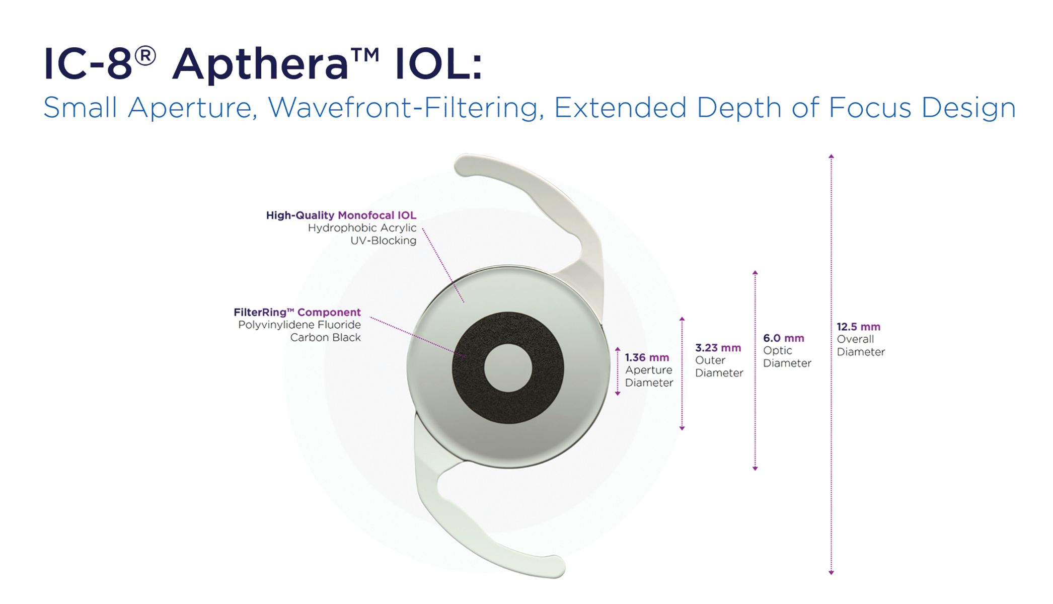 The Apthera lens is an aspheric monofocal IOL with an embedded small aperture, referred to as the FilterRing component (Figure 2). This unique design filters out peripheral defocused and aberrated light and allows central focused light to reach the retina undisturbed, thereby delivering extended depth of focus.