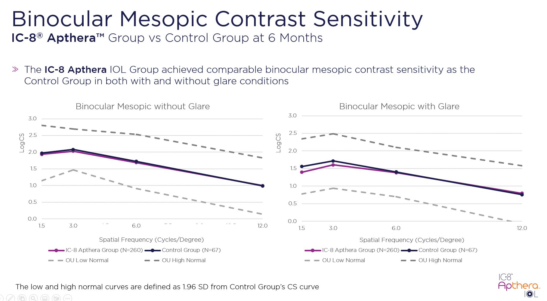 Figure 4. Binocular mesopic contrast sensitivity in both with and without glare conditions for Apthera IOL patients vs control group patients with bilateral monofocal IOLs. (Images courtesy of AcuFocus)