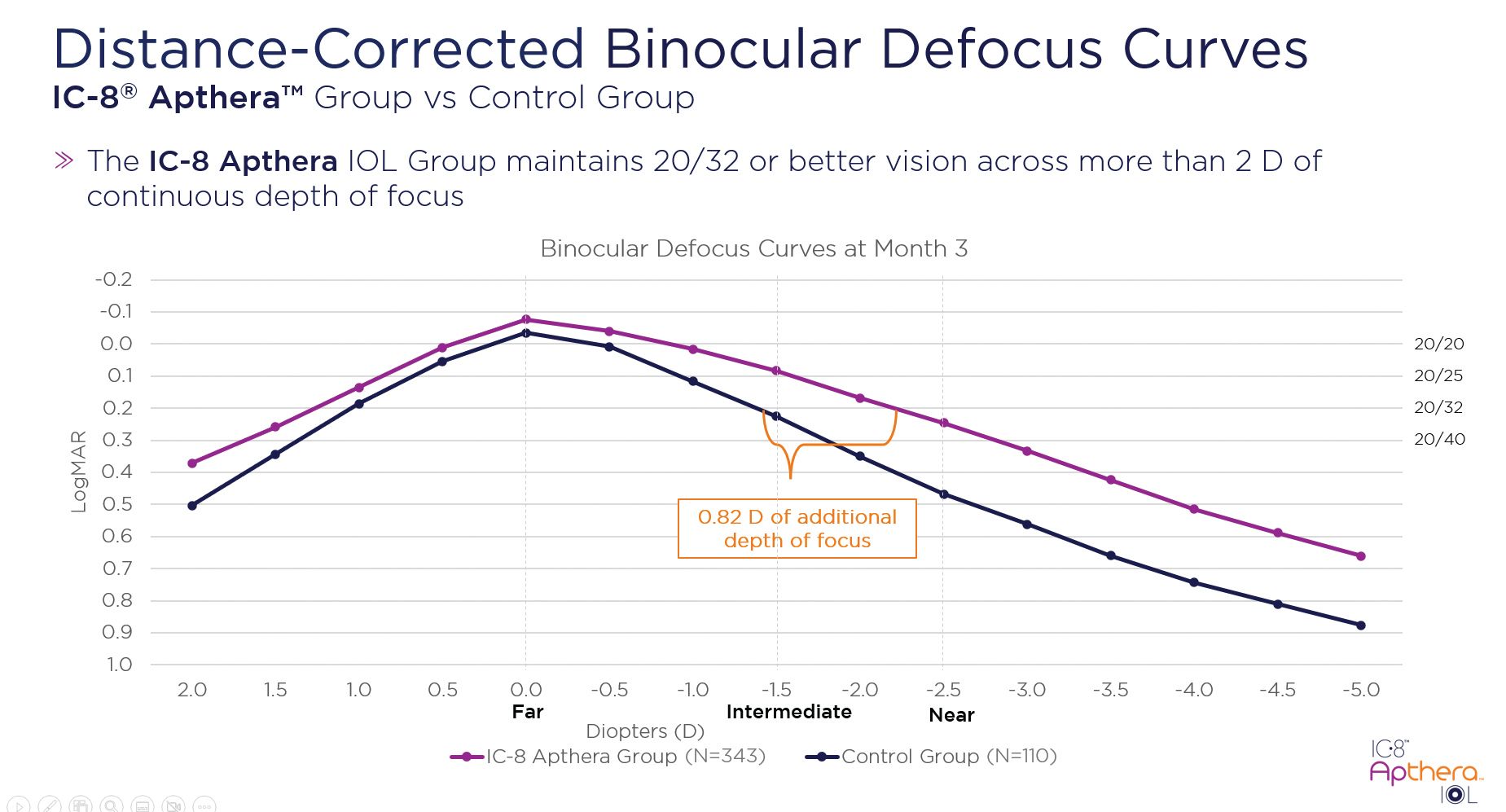 Figure 3. Distance-corrected binocular defocus curve for Apthera IOL patients (n = 343) vs control group patients with bilateral monofocal IOLs (n = 110).